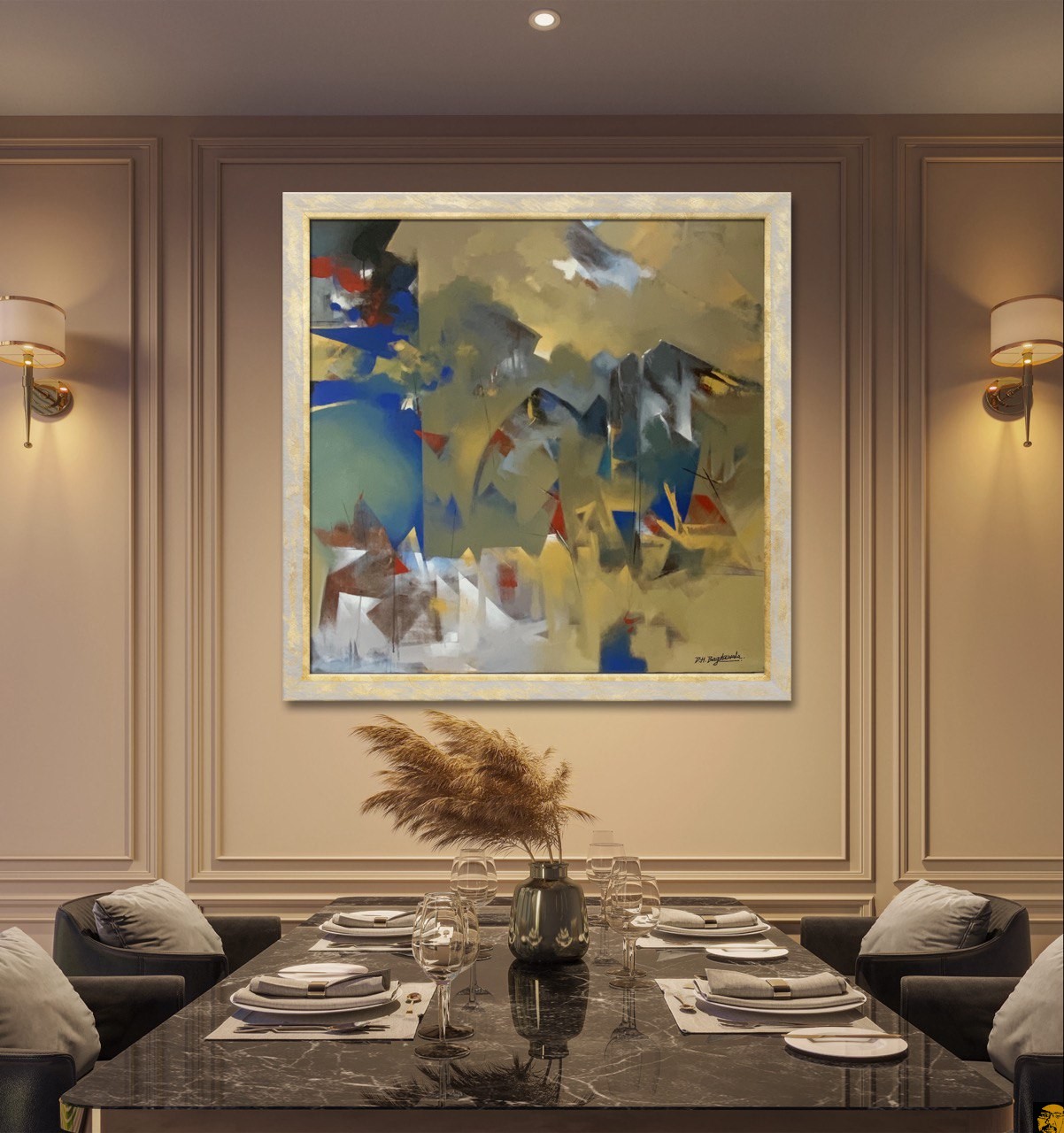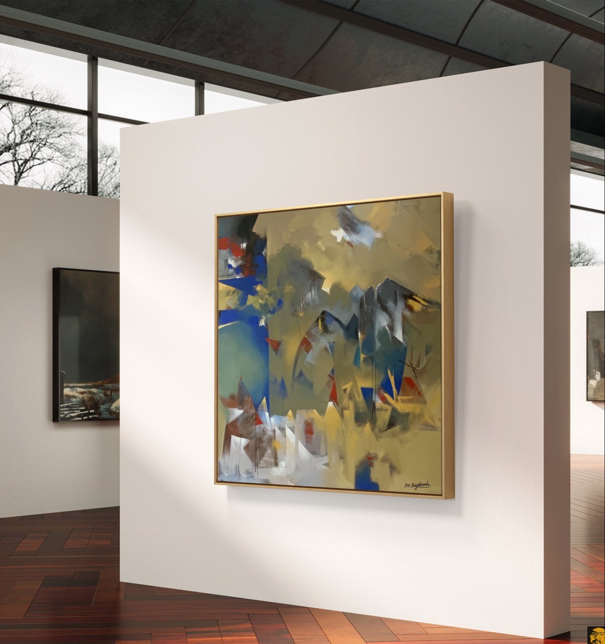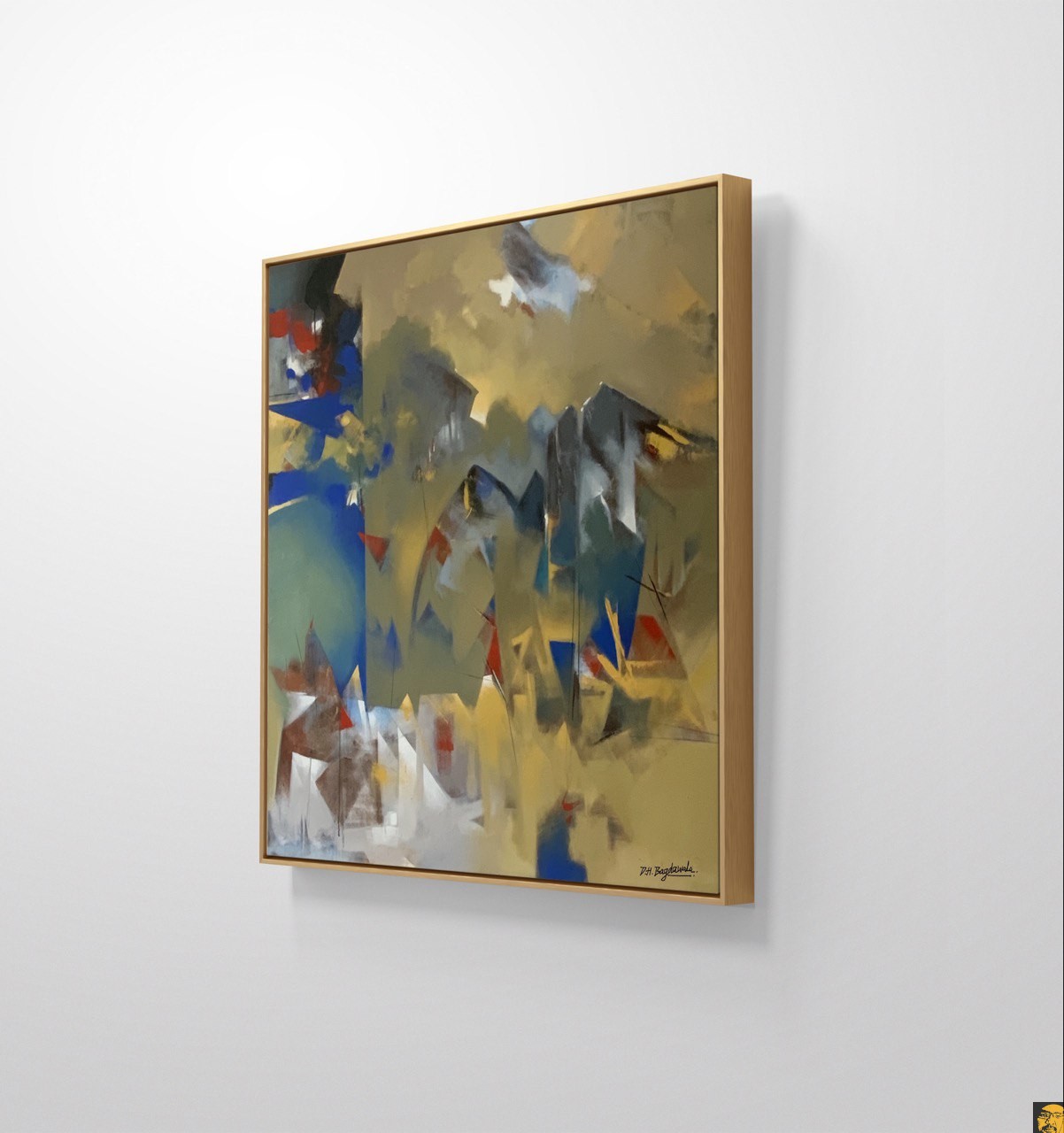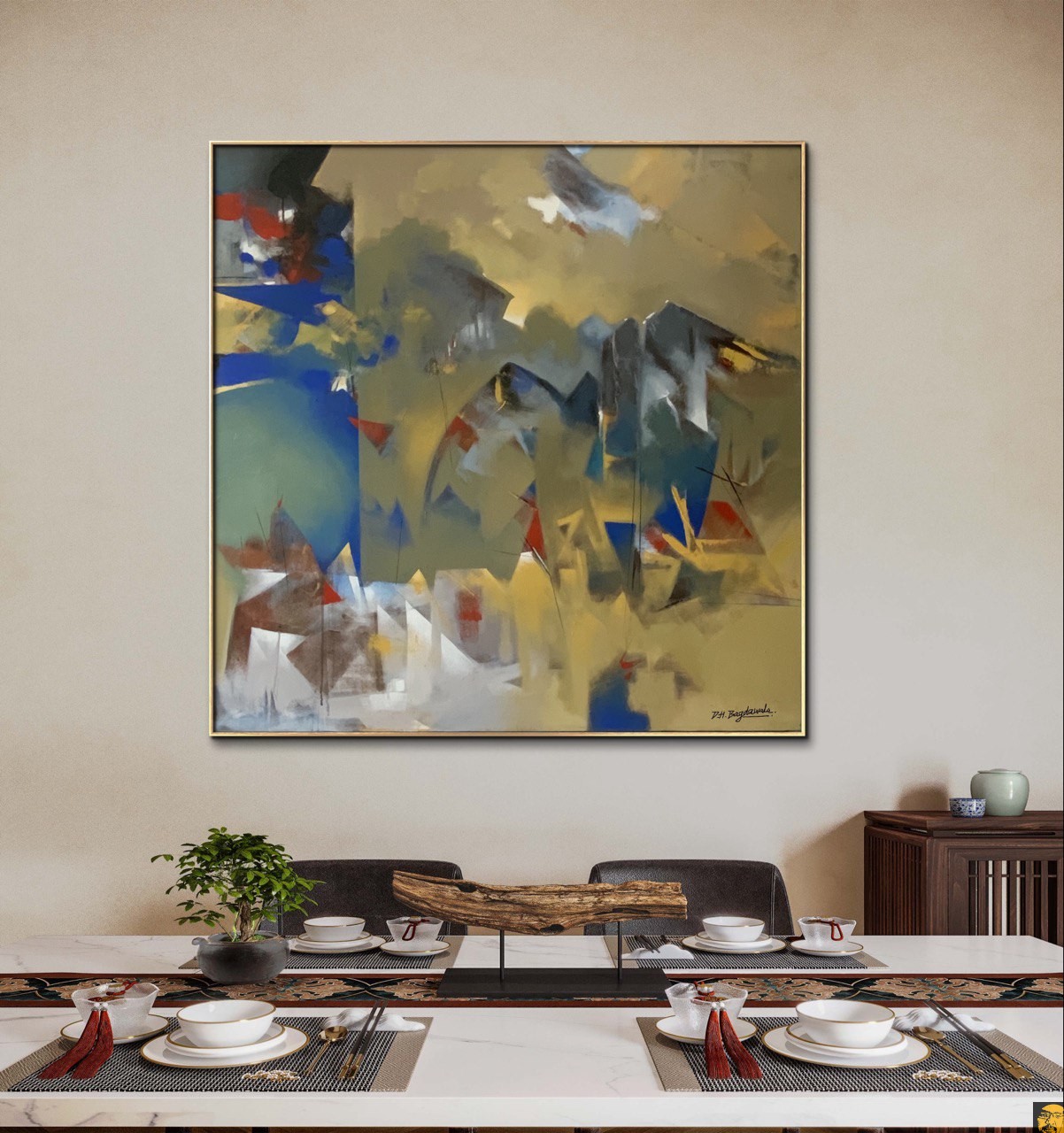 Price: On request | Shipping: Rolled / Framed - Description: Creating an abstract landscape inspired by Varanasi involves capturing the essence and spirituality of this ancient city on the banks of the Ganges River. Varanasi, also known as Banaras or Kashi, is renowned for its ghats, temples, and bustling spiritual atmosphere. Here’s how you can approach creating an abstract representation of Varanasi Varanasi is known for its spiritual significance and religious fervor. Capture the essence of spirituality, devotion, and ritualistic practices that define the city. Historic Charm: Incorporate elements that reflect the ancient and historical aspects of Varanasi. This could include hints of architectural motifs, traditional patterns, or symbolic representations. Focus on the iconic ghats of Varanasi, which are steps leading down to the river. Use abstract forms or lines to suggest the architecture and bustling activity found along the ghats.Depict the flowing waters of the Ganges using fluid lines, gradients of blues and greens, or textured brushstrokes to convey movement and vitality. Abstract art allows for emotional and symbolic expression. Infuse your artwork with a sense of reverence, contemplation, or mysticism that resonates with the spiritual ambiance of Varanasi. Encourage viewers to interpret the artwork through their own experiences and perceptions, inviting them to connect with the essence of Varanasi on a personal level. Creating an abstract landscape inspired by Varanasi offers a unique opportunity to explore its rich cultural heritage and spiritual significance through artistic expression. Embrace creativity, experimentation, and the evocative power of abstraction to capture the timeless allure of this ancient city.